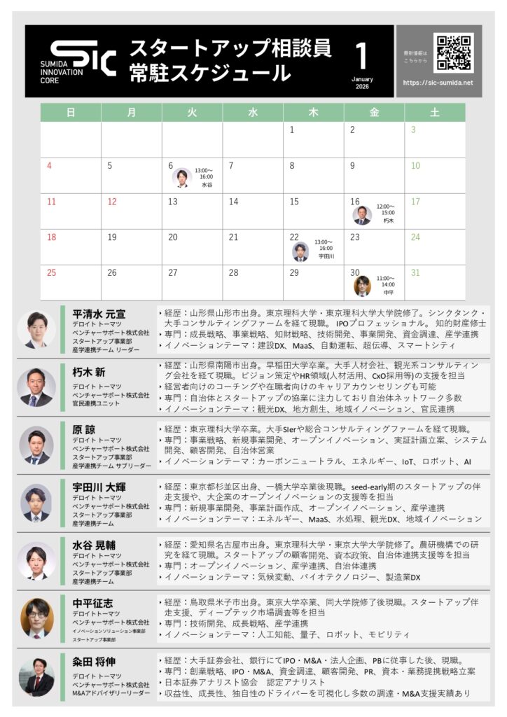 【2026年1月】スタートアップ相談員 常駐スケジュール